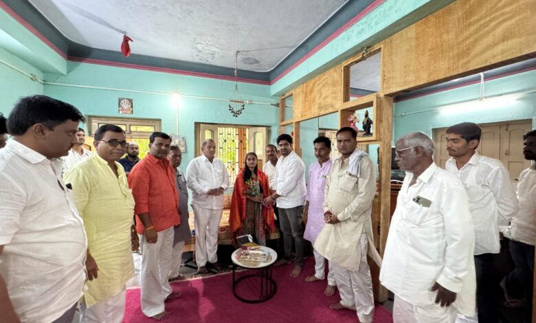 दि.16 आॕगष्ट 2025 रोजी धनेगाव येथील मा.सरपंच श्री.सुहास गुजर यांची कन्या कु. श्रावणी सुहास गुजर ही विध्यार्थीनीची नांदेड शासकीय महाविद्यालय येथे B.D.S या शिक्षणा साठी पात्र झाल्यामुळे कु.श्रावणी हिस शाबासकीची थाप देत पुष्प देऊन अभिनंदन करताना,अंबेजोगाई सहकारी साखर कारखान्याचे संचालक श्री.ऋषिकेश भैय्या आडसकर तसेच मा. सरपंच सतिष गुजर, चेअरमन विकास पाटील,कृषी बाजार समितीचे संचालक पशुपती पाटील,कृषी उत्पन्न बाजार समितीचे संचालक रामकिसन बाबा खोडसे,शिवदास थळकरी,रघुनंदन मोरे, बाळासाहेब नांदे, धनेश्वर गुजर,शंकर इंगळे,शाम खोडसे, गजानन गोरे,विशाल खोडसे,अमरदीप शिंदे आदी मान्यवर तसेच ग्रामस्थ यावेळी मोठ्या संख्येने उपस्थित होते.