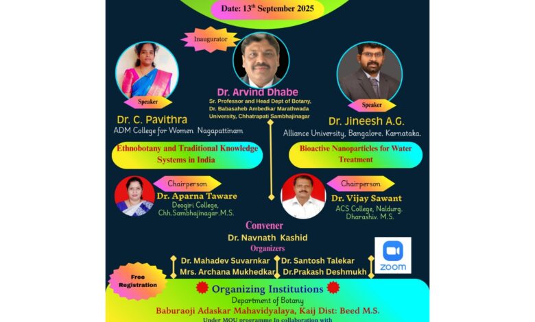 जीव विज्ञानातील नवनवीन संशोधन मानवाच्या शाश्वत व सर्वांगीण विकासासाठी याविषयी सखोल माहिती होण्यासाठी, तसेच जीवविज्ञानातील नवीन व सद्यस्थितीतील प्रवाह यावर राष्ट्रीय आभासी चर्चासत्राचे आयोजन वनस्पती शास्त्र विभाग बाबुरावजी आडसकर महाविद्यालय केज जिल्हा बीड व श्रीमती केशरबाई सोनाजीराव क्षीरसागर महाविद्यालय बीड तसेच शिक्षण महर्षी ज्ञानदेव मोहेकर महाविद्यालय कळंब जिल्हा धाराशिव व कै. शंकरराव गुट्टे ग्रामीण महाविद्यालय धर्मापुरी तालुका परळी जिल्हा बीड यांच्यातील सामंजस्य कराराअंतर्गत या चर्चासत्राचेआयोजन करण्यात आले आहे.