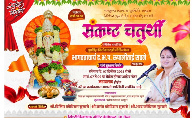 कुंबेफळ ता.केज येथे संकष्टी चतुर्थीच्या निमित्ताने सुरवसे कुटुंबाच्या वतीने भागवताचार्य ह.भ.प रुपालीताई सवने यांचे किर्तन आयोजित करण्यात आले आहे.