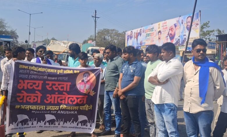 लातुर जिल्ह्यातील औसा येथील जवाहर नवोदय विद्यालयात सहावीच्या वर्गात शिक्षण घेणाऱ्या दलित मातंग समाजातील एका अल्पवयीन विद्यार्थिनीच्या संशयास्पद मृत्यूची गंभीर घटना उघडकीस आली आहे.या घटनेची सखोल चौकशी करून दोषी विरुद्ध अॕट्रॉसिटीचा व खुनाचा गून्हा नोंद करण्यात यावा. या मागणीसाठी केज येथील छत्रपती शिवाजी महाराज चौकातसोमवारी सकाळी ११ वाजता केज तालुक्यातील सकल दलित (मातंग) समाज कृती समितीच्या वतीने दिड तास रास्ता रोको आंदोलन करण्यात आले.