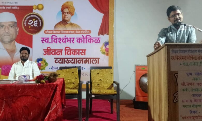 संतवाणीतूनच शुद्ध आचरण कसे असावे हे स्पष्ट होते. काळ कुठलाही असो संतांची प्रासंगिकता कायम तीच राहते. कारण माध्यम जरी बदलली तरी नैतिक मूल्यांची आवश्यकता बदलत नाही.संतवाङमय हे अनुभवातून निर्मिलेले साहित्य आहे.तसेच संत साहित्य हे मानवाला बाह्य जगतापेक्षा अंतर्मुख होऊन स्वतःचा शोध घेण्यास प्रवृत्त करते असे प्रतिपादन ह.भ.प.प्रणव महाराज पटवारी यांनी केले.केज येथील स्वामी विवेकानंद विद्या मंदिर या शाळेमध्ये दि.२० एप्रिल वार सोमवार पासून स्व.विश्वंभर कोकिळ जीवन विकास व्याख्यान मालेला नुकतीच सुरुवात झाली. यावर्षी याव्याख्यानमाले ने २६ व्या वर्षात पदार्पण केले.तेंव्हा या व्याख्यान मालेचा शुभारंभ प्रमुख वक्ते ह.भ.प.प्रणव महाराज पटवारी कवी, लेखक,प्रबोधनकार, माजलगाव यांच्या शुभहस्ते दिपप्रज्वलनाने झाला.